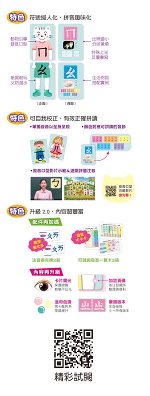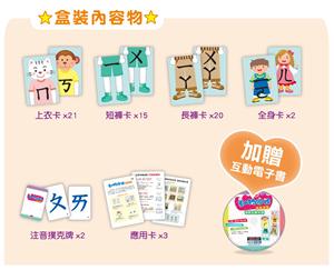以服裝搭配概念,引領幼兒進行注音符號的拼讀,在遊戲中組合與練習拼音。卡片背面附有實照例詞與拼音表,可進營拼音練習,上光設計,可使用水性筆重複書寫練習。搭贈豐富的電子資源,包含互動遊戲評量光碟,以及真人發音嘴型影片,讓孩子透過遊戲進行拼音複習。
