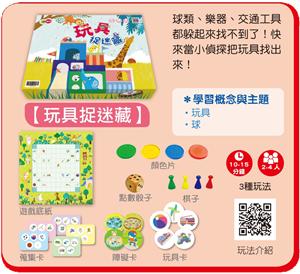 遊戲底紙1張、顏色片12個、棋子4個、點數骰子1顆、蒐集卡5張、障礙卡4張、玩具卡25張