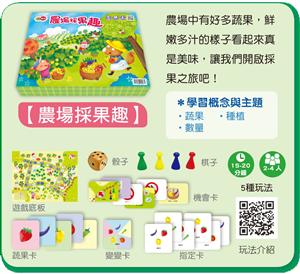 遊戲底板1塊、骰子1顆、棋子4個、機會卡9張、蔬果卡20張、變變卡6張、指定卡6張
